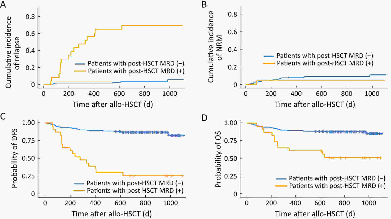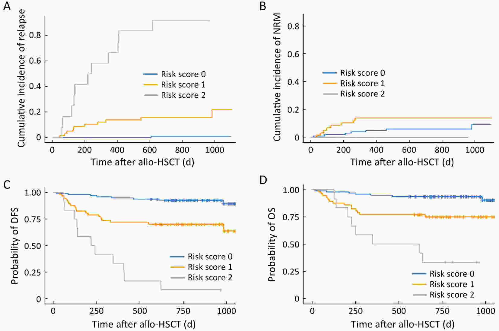 ObjectiveAllogeneic hematopoietic stem cell transplantation (allo-HSCT) is the only potentially curative method for treating myelodysplastic syndrome (MDS). Post-HSCT measurable residual disease (post-HSCT MRD) is associated with inferior transplant outcomes. In this prospective study, we aimed to investigate the prognostic value of post-HSCT MRD in relapse prediction in MDS. MethodsA total of 166 patients diagnosed with MDS were prospectively enrolled in this study. The Kaplan-Meier method was used to calculate the survival probabilities. Potential risk factors for outcomes after transplantation were evaluated through univariate and multivariate Cox regression models. ResultsFor patients with negative and positive post-HSCT MRD, the cumulative incidence of relapse (CIR) and disease-free survival (DFS) at 3 years were 5.9% and 69.6% (P<0.001) and 82.7% and 26.1% (P<0.001), respectively. In the multivariate analysis, post-HSCT MRD (HR=22.801, P<0.001) and Revised International Prognostic Scoring System (IPSS-R) risk stratification (HR=4.346, P=0.003) were independently correlated with relapse. A scoring system for relapse prediction was built based on post-HSCT MRD and IPSS-R stratification. The cumulative incidence of relapse at 3 years was 1.1%, 15.8%, and 91.7% for patients with scores of 0, 1, and 2, respectively (P<0.001). ConclusionsOur results demonstrated both post-HSCT MRD and IPSS-R scores were independent prognostic factors for OS, DFS, and relapse for MDS patients after allo-HSCT. The risk score system could better predict transplant outcomes and refine the risk stratification than alone in patients with MDS.