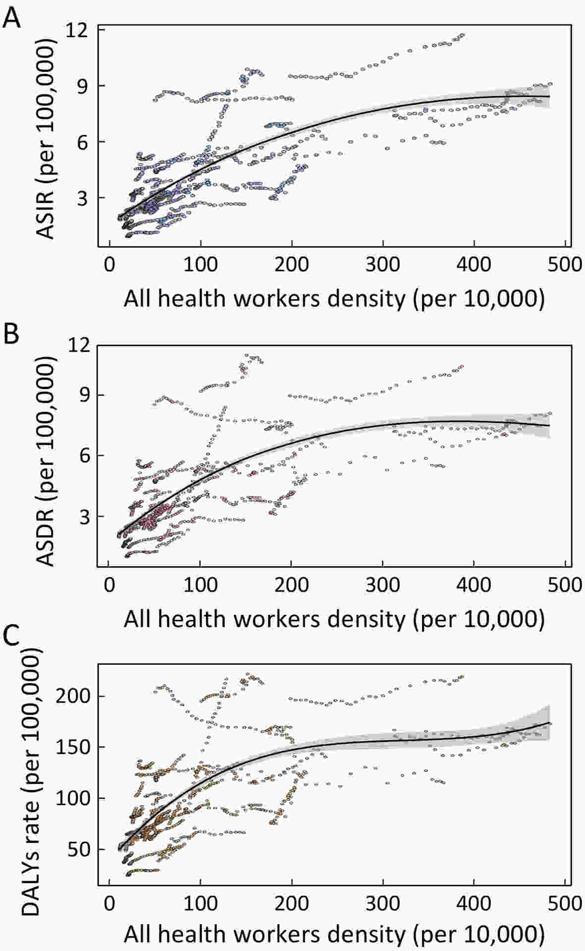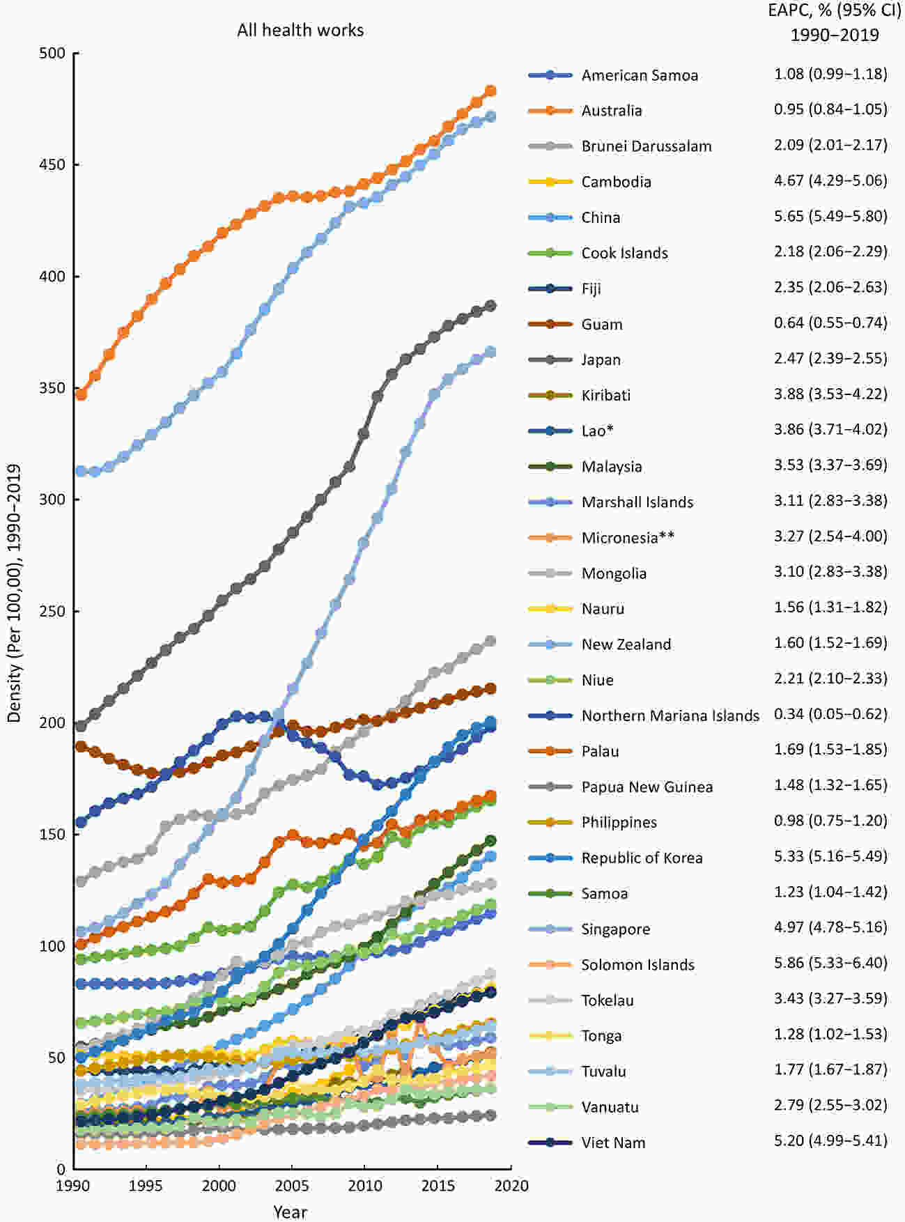 ObjectivePancreatic cancer is a global health challenge, yet the Western Pacific Region (WPR) lacks comprehensive analysis of its burden and human resources for health (HRH) distribution. This study aims to assess trends in pancreatic cancer and HRH density in the WPR and investigate their relationship. MethodsPancreatic cancer data from GBD 2021 and annual HRH density from GBD 2019 were analyzed. Joinpoint regression was used to analyze temporal trends of pancreatic cancer burden and HRH density across 31 countries of the WPR. Spearman’s rank correlation analysis and generalized linear models were applied to investigate the association between HRH density and pancreatic cancer burden. ResultsFrom 1990 to 2021, pancreatic cancer incidence in the WPR increased by 209%, from 59,766 to 184,612 cases, with a 201% rise in mortality and a 152% increase in disability-adjusted life years (DALYs). In 2021, smoking and high fasting plasma glucose were major risk factors, responsible for 16.43% and 23.29% of deaths, respectively. HRH density was positively correlated with the age-standardized incidence (P=0.767), death (P=0.752), and DALYs (P=0.726) rates of pancreatic cancer, and in 2019, most countries’ HRH densities were below the Universal Health Coverage targets. ConclusionsDespite improvements in HRH, notable distribution inequalities and shortages persist, limiting capabilities in pancreatic cancer diagnosis and treatment. The positive association between burden and HRH density reflects improved diagnostics from HRH growth but persistent treatment insufficiency due to shortages, and suggests that targeted HRH investment, strengthened primary care, and integration of palliative care are crucial to alleviating the burden.