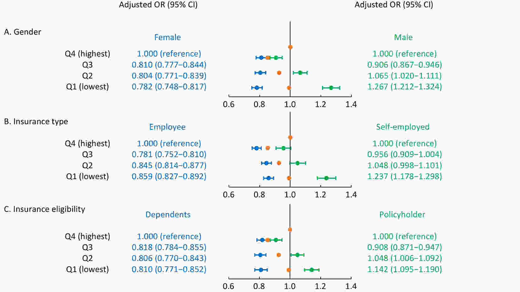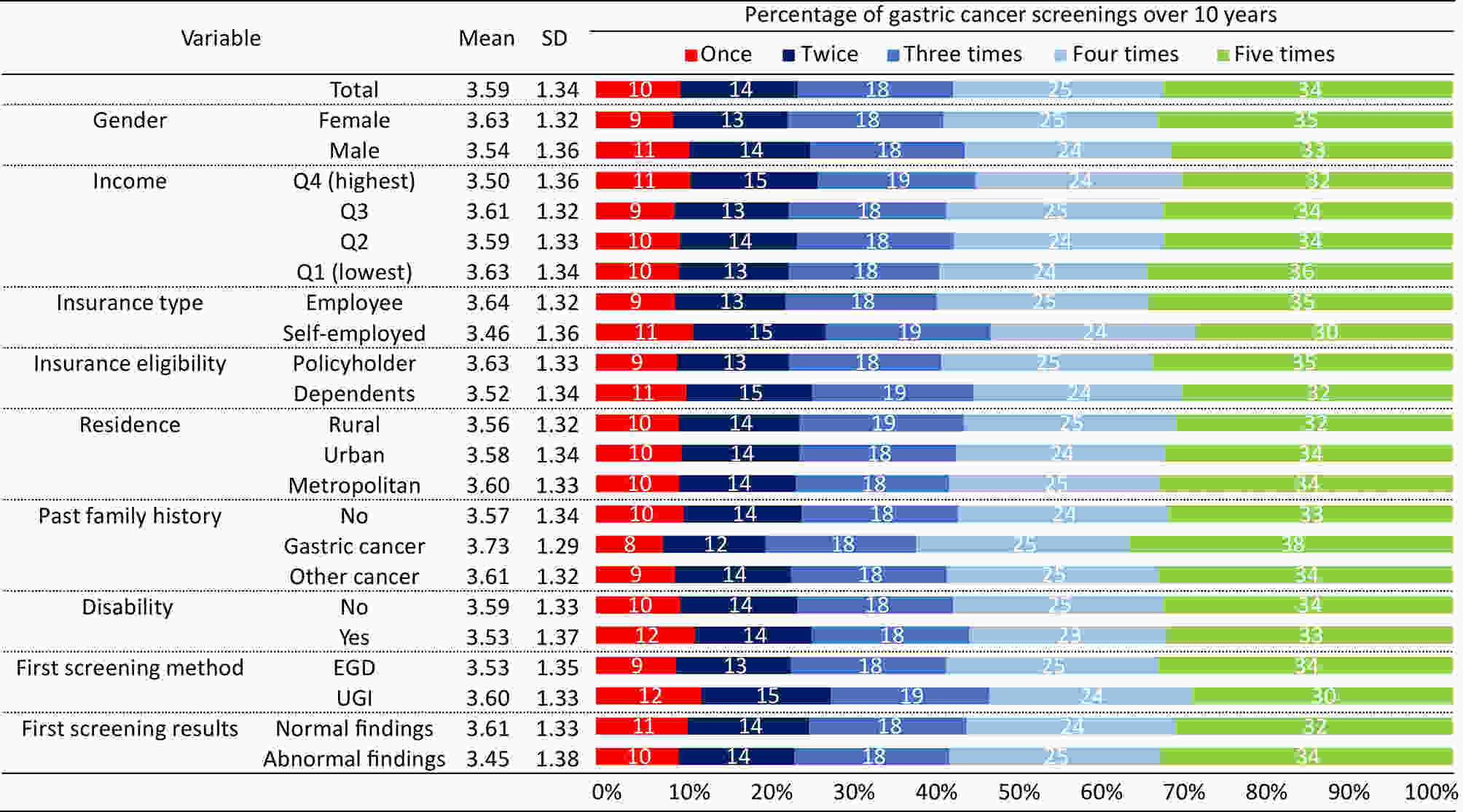 ObjectiveRegular cancer screening must be monitored to improve gastric cancer (GC) survival rates and maximize participation. This study examined adherence to regular GC screening over a 10-year period and identified the factors influencing adherence. MethodsThis retrospective cohort study was conducted using data from the Korean National Cancer Screening Program (KNCSP) between 2011 and 2020. The total cohort comprised 400,113 adults aged 40 years who were newly eligible for and participated in GC screening in 2011. The participants were followed up for 10 years to assess their adherence to biennial screening recommendations. They were categorized into two groups: the non-regular screening (non-RS) group, which included individuals who did not participate in subsequent screenings, and the regular screening (RS) group, which included those who participated in at least one follow-up screening. Multiple logistic regression analyses were performed to identify the factors associated with adherence to regular GC screening. ResultsOver 10 years, 59% of the participants completed at least four of the five recommended screenings, while 10% did not participate after their initial screening. Male participants had higher odds of non-adherence than females [adjusted odds ratio (aOR)=1.429, 95% confidence interval (95% CI): 1.394−1.464; P<0.001]. Non-adherence was more prevalent among self-employed individuals (aOR=1.208, P<0.001). Among males, those in the lowest income group were 1.267 times more likely to not undergo regular screening than those in the highest income group. ConclusionsLong-term adherence to regular GC screening in South Korea remains suboptimal. Socioeconomic disparities persist, highlighting the need for tailored interventions to improve adherence and enhance public health.