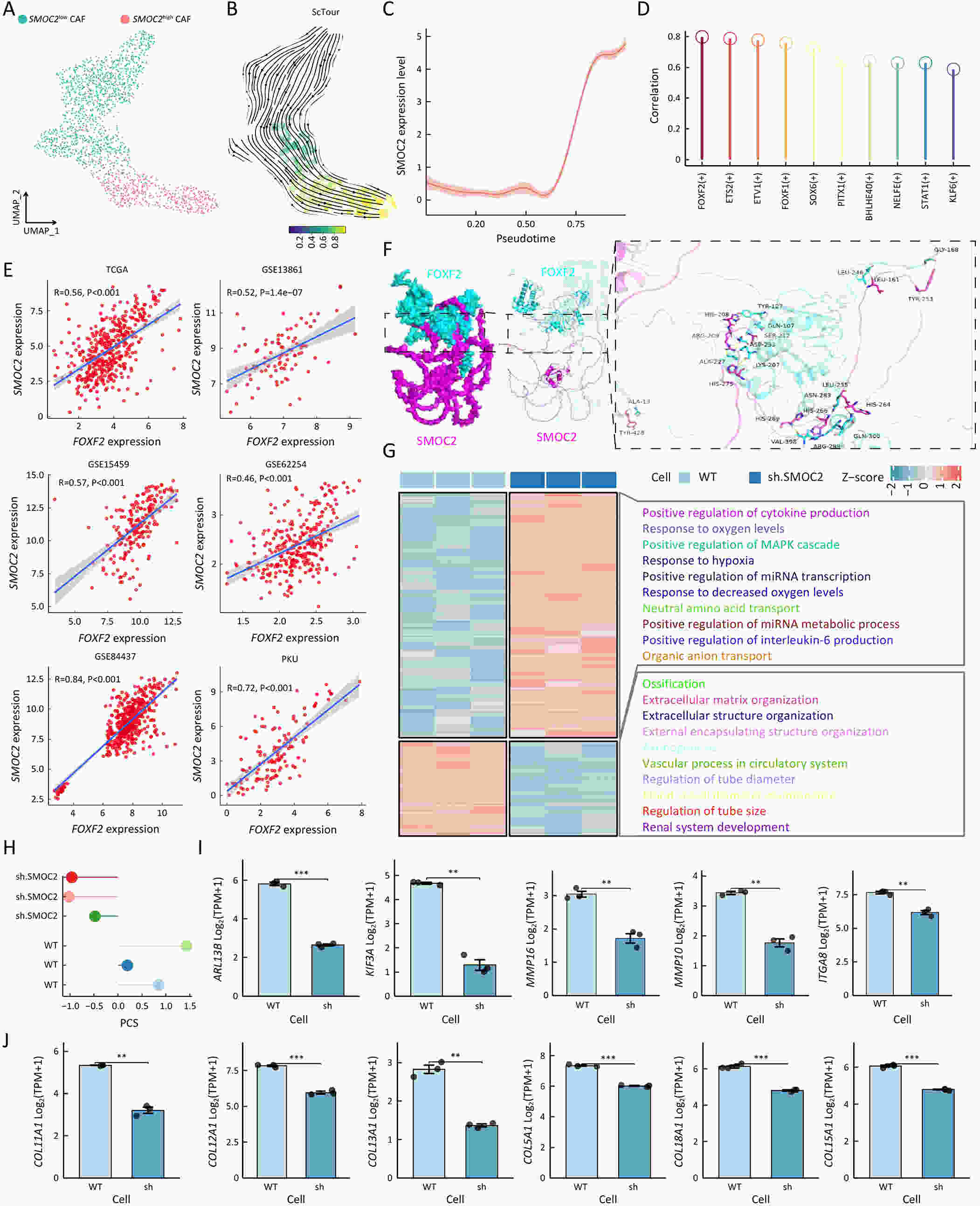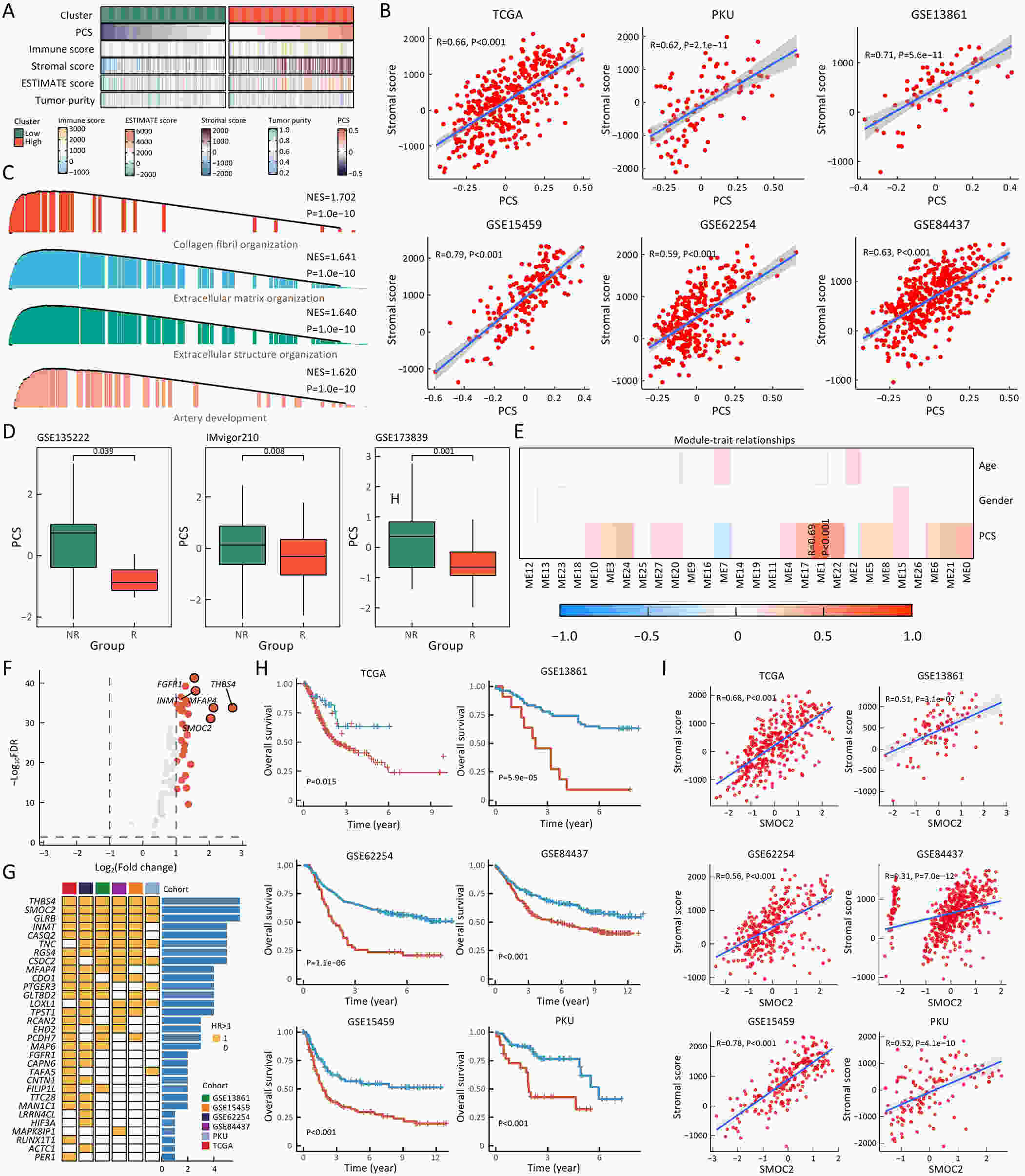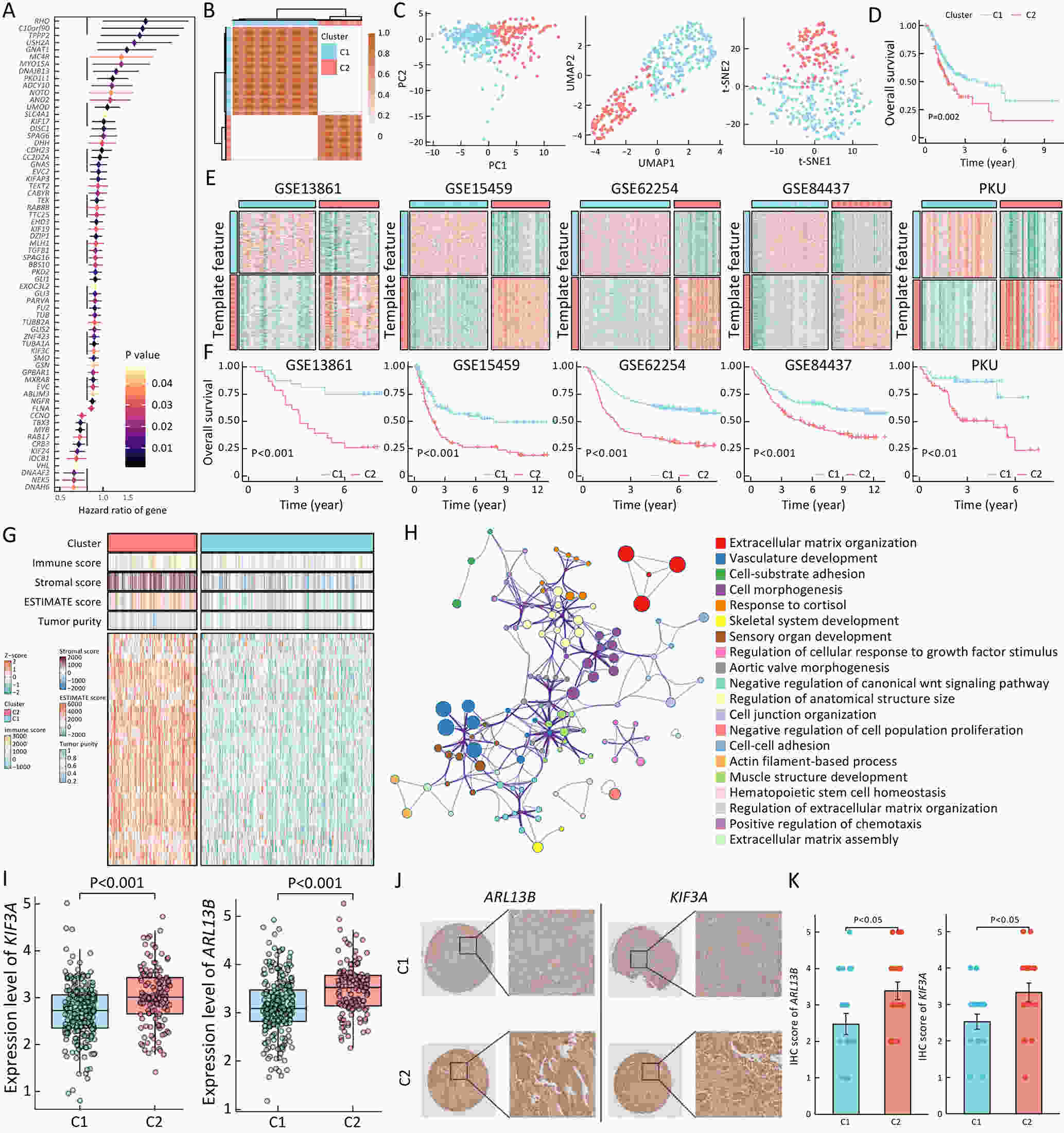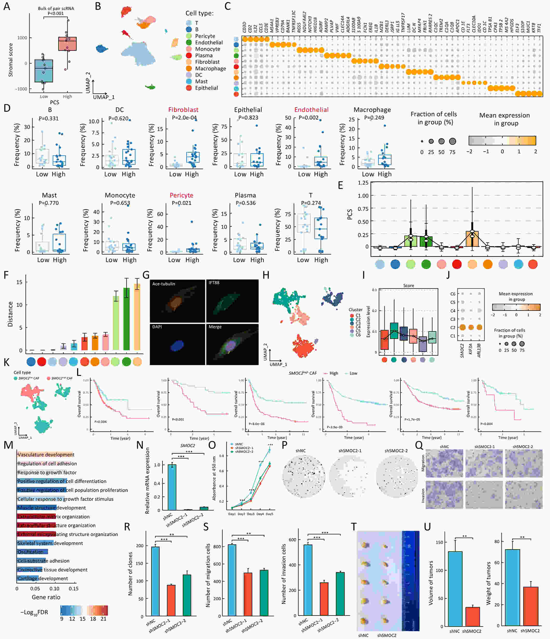 ObjectiveAdvanced gastric cancer remains highly refractory to therapy, with limited immunotherapy efficacy due to tumor microenvironment heterogeneity. Primary cilia, microtubule-based organelles involved in tumor progression, remain insufficiently explored in gastric cancer. This study aimed to define primary cilia subtypes and establish prognostic signatures for personalized treatment strategies. MethodsBulk transcriptomic data from over 1,500 gastric cancer samples were integrated to define distinct primary cilia subtypes. A primary ciliary phenotype-associated signature (PCS) was established using a multi-machine learning survival framework incorporating ten algorithms. The prognostic predictive value and immunotherapy response prediction capability of PCS were validated across multiple independent cohorts. Single-cell RNA sequencing analysis was performed to identify cellular populations associated with high-PCS phenotype. Causal weighted gene co-expression network analysis (WGCNA) was employed to identify driving factors, followed by functional validation through cell culture experiments and xenograft models. ResultsTwo distinct primary cilia subtypes were identified and validated across all cohorts, with C2 patients exhibiting significantly worse overall survival compared to C1 patients. PCS demonstrated robust predictive value for both prognosis and immunotherapy response, with superior accuracy compared to existing models across multiple validation cohorts. High-PCS patients showed reduced tumor purity, increased stromal cell infiltration, and poor response to immunotherapy. Single-cell analysis revealed that fibroblasts had the highest PCS scores and identified a novel secreted modular calcium-binding protein 2 (SMOC2)high myofibroblastic cancer-associated fibroblast (mCAF) population as the key driver of high-PCS phenotype. Functional experiments confirmed that SMOC2 knockdown significantly suppressed gastric cancer cell proliferation, migration, and invasion, while promoting mCAF-to-inflammatory cancer-associated fibroblasts (iCAF) transition. ConclusionsPCS serves as a robust prognostic biomarker for gastric cancer patients. Additionally, targeting SMOC2high mCAFs represents a potential therapeutic strategy for patients with high-PCS gastric cancer.