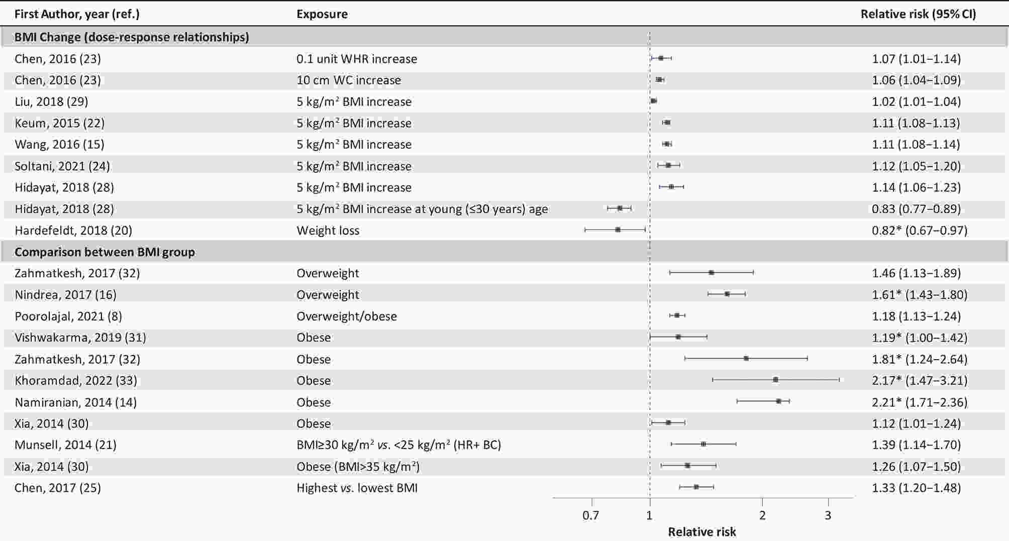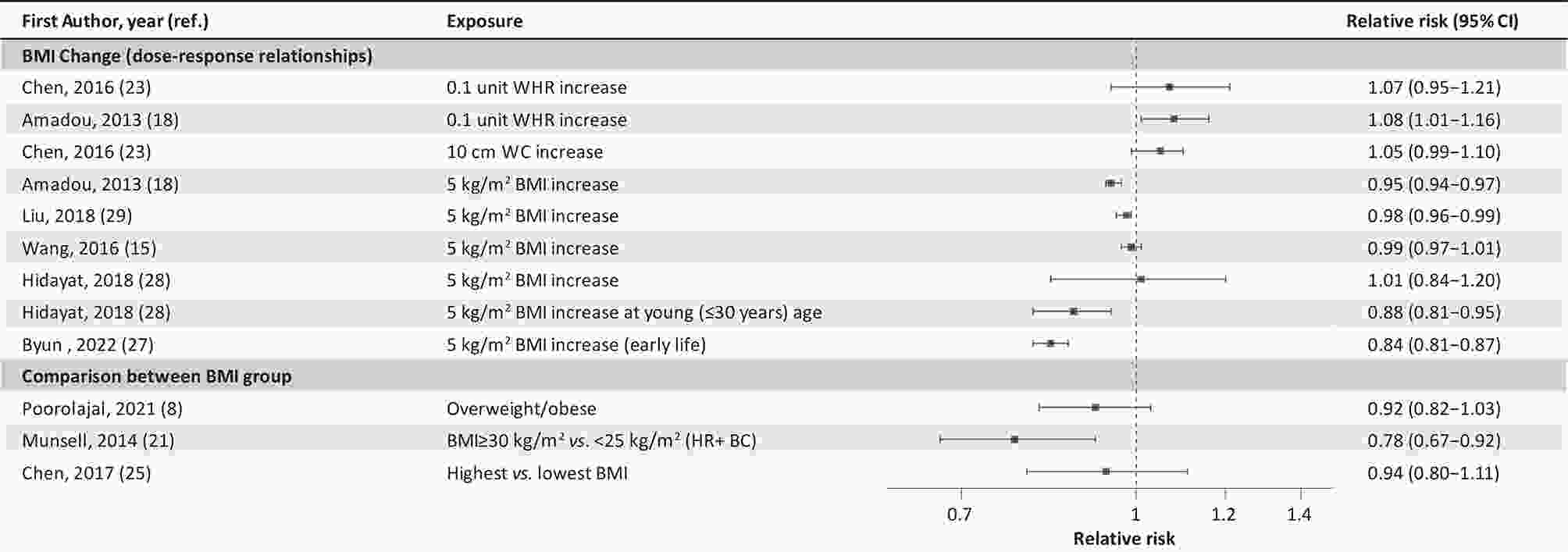 ObjectiveHeterogeneity in the evidence of association between lifestyle factors and breast cancer (BC) incidence hampers initiatives to modify BC risk. This overview aims to synthesise evidence from systematic reviews (SRs) to inform lifestyle-related modifications for BC prevention. MethodsWe systematically searched (MEDLINE, EMBASE, and CINAHL) from January 2013 to August 2023 for SRs of the association between lifestyle factors [alcohol consumption, physical activity (PA), body mass index (BMI), smoking, breastfeeding, oral contraception (OC), hormone replacement therapy (HRT), and sedentary behavior (SB)] and BC incidence. A narrative data synthesis was performed. ResultsSixty-six SRs met the eligibility criteria. Evidence from 40 SRs indicated consistent associations between the risk of BC and postmenopausal BMI increase (relative risk increase: 2%−21%), use of HRT (risk increase: 23%−33%), smoking (risk increase: 4%−86%), and alcohol consumption (risk increase: 4%−61%). Additionally, evidence from 23 SRs suggested protective associations with PA (risk decrease: 10%−39%), breastfeeding (risk decrease: 9%−53%), and healthy lifestyle scores (protective about 20%−26%). However, inconsistent and/or statistically non-significant associations were found between BC incidence and premenopausal BMI increase [relative risk (RR): 0.78−1.08], SB (RR: 1.01−1.20), and OC use [odds ratio (OR): 1.01−1.35]. ConclusionsThis overview identifies lifestyle factors associated with BC incidence, highlighting both harmful and protective factors. Our summary findings can support information and interventions related to modifying these factors, including limiting alcohol and smoking, or avoiding postmenopausal BMI increase and HRT.