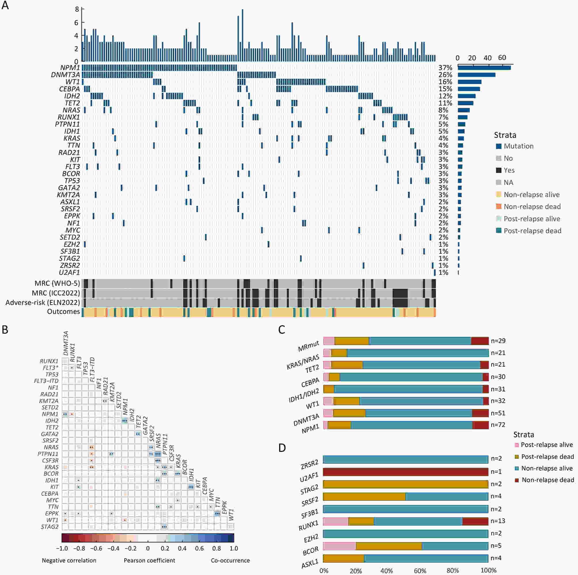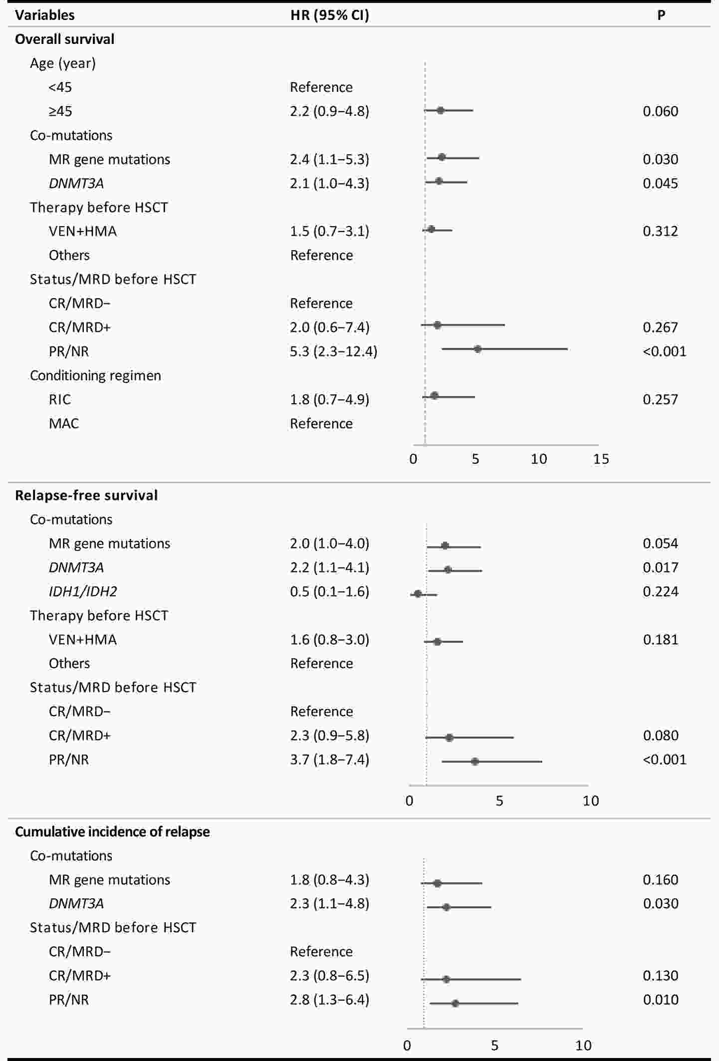 ObjectiveAcute myeloid leukemia (AML) patients with internal tandem duplications in the FMS-like tyrosine kinase 3 receptor gene (FLT3-ITD) receiving tyrosine kinase inhibitors maintenance after allogeneic hematopoietic stem cell transplantation (allo-HSCT) demonstrated improved survival outcomes, however, some still experienced relapse during the maintenance. This study aimed to explore risk factors which might be indicators for poor survival after allo-HSCT in this population. MethodsWe consecutively enrolled FLT3-ITD AML patients undergoing transplantation at three centers. By integrating genetic profiles with clinical information, we assessed their impact on transplant outcomes. ResultsA total of 196 patient were eligible in the analysis, among whom 14% harbored myelodysplasia-related (MR) mutations, including ASXL1, BCOR, EZH2, RUNX1, SF3B1, SRSF2, STAG2, U2AF1, and ZRSR2. Co-mutant MR was independently associated with poorer overall survival (OS) [hazard ratio (HR): 2.4, 95% confidence interval (95% CI): 1.1−5.3, P=0.030]. DNMT3A co-mutations strongly predicted adverse survival and relapse [OS: HR: 2.1, 95% CI: 1.0−4.3, P=0.045; relapse-free survival (RFS): HR: 2.2, 95% CI: 1.1−4.1, P=0.017; cumulative incidence of relapse (CIR): HR: 2.3, 95% CI: 1.1−4.8, P=0.030]. Compared to patients with negative measurable residual disease (MRD) complete remission (CR), no significant differences were observed in CR patients with positive MRD, while those without CR exhibited significantly inferior outcomes (P=0.003). ConclusionsPatients with myelodysplasia-related gene mutations (MRmut) and/or DNMT3A mutations experienced inferior outcomes after transplantation, requiring further exploration. Furthermore, similar prognoses among CR patients highlighted the need for monitoring specific molecular residual lesions.